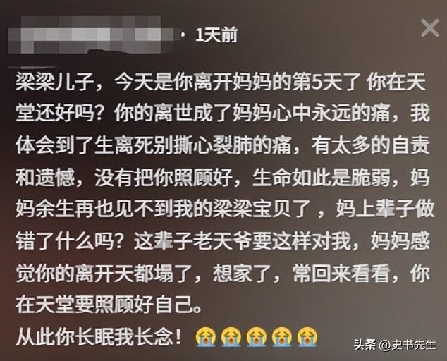 但孩子突然的离世,妈妈更是感觉到了撕心裂肺的痛,在感慨生命脆弱的同时,更是深深的自责自己没有照顾好孩子,这可能也是作为家长永远的遗憾。