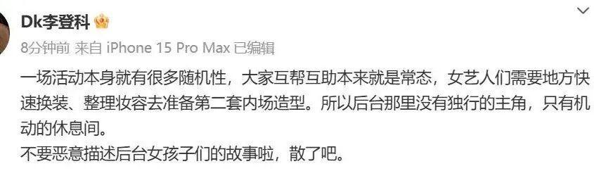 12日,曝二字话题女星抢娜扎休息室引热议。刚刚娜扎经纪人李登科回应称一场活动本身有很多随机性,大家互帮互助是常态,后台没有独行的主角,只有机动的休息间,“不要恶意描述后台女孩子们的故事,散了吧。” 刘冲也回应称:“别造谣了,善良一点吧。”