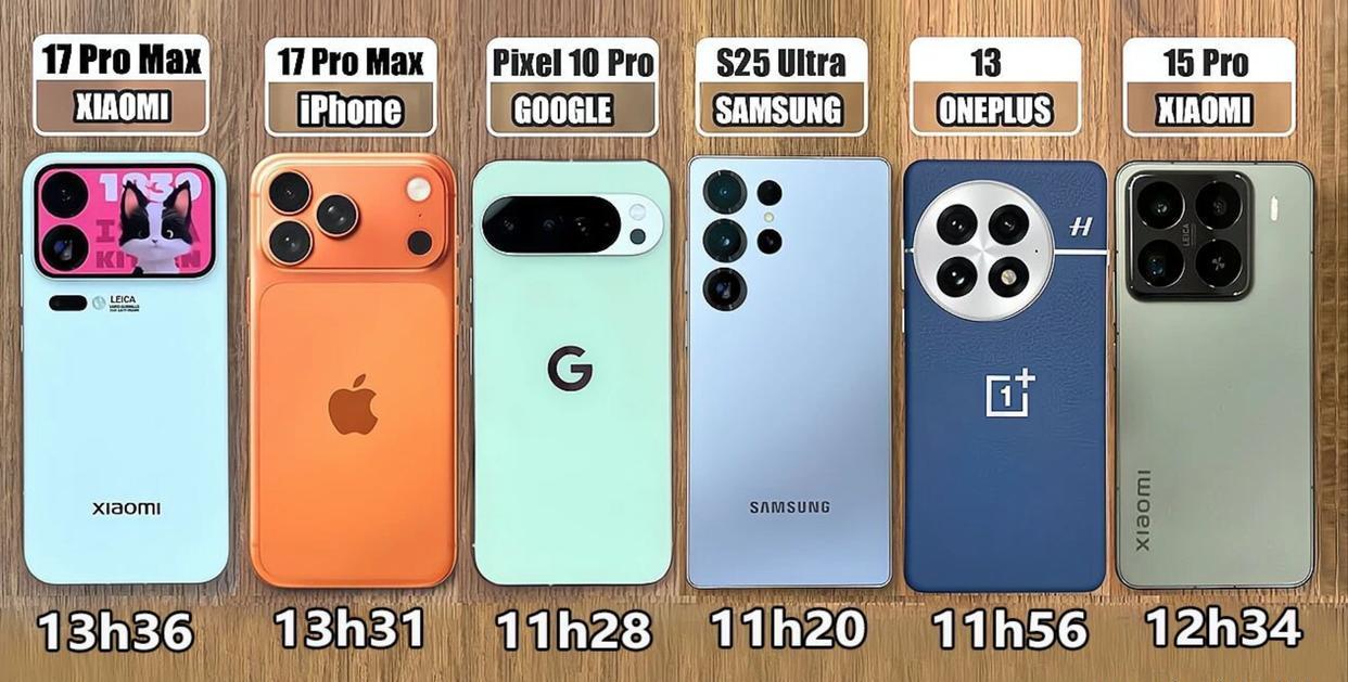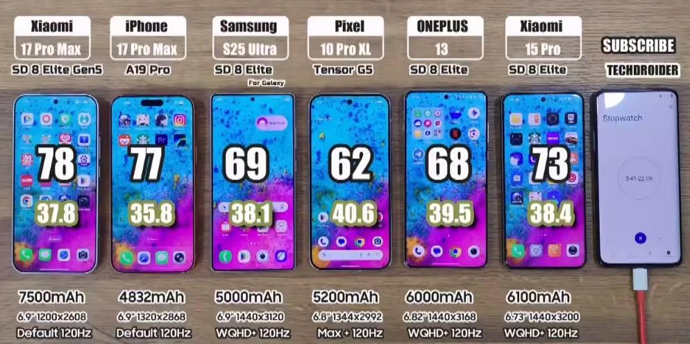 近日,YouTube知名频道TechDroider进行了一项手机续航实测,将小米17 Pro Max、苹果iPhone17 Pro Max、三星、一加13、谷歌等热门机型纳入测试范围。测试结果颇具戏剧性,令人大跌眼镜。