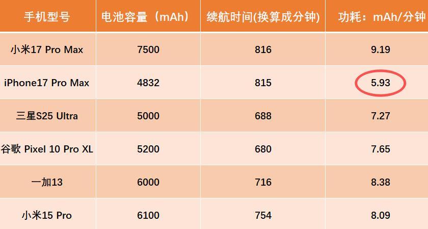 然而,当我们进一步分析电池容量与续航时间的关系,计算出每分钟功耗后,发现了一个有趣的结论。苹果iPhone17 Pro Max的每分钟功耗最低,仅为5.93mAh;而小米17 Pro Max则最高,达到9.19mAh。三星与谷歌的功耗表现相对较好,均在7mAh多一点;一加13与小米15 Pro的功耗则略高,超过8mAh。