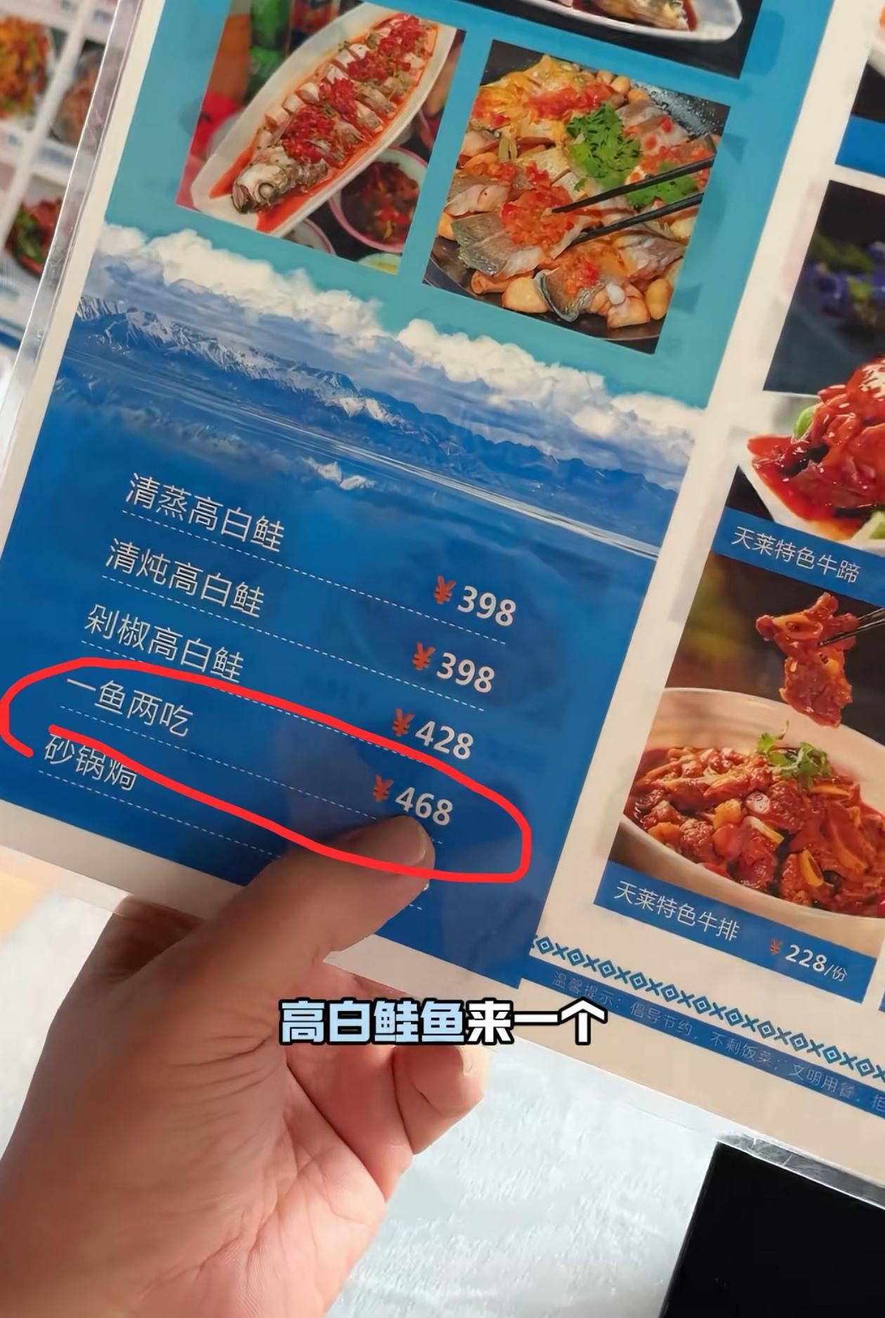 既然来到了赛里木湖,那肯定要点高白鲑鱼。一份清蒸的要398元,但是一鱼两吃(一条鱼做两道菜)是468元,他们觉得这个更划算,于是选择了一半清蒸,一半砂锅的做法。