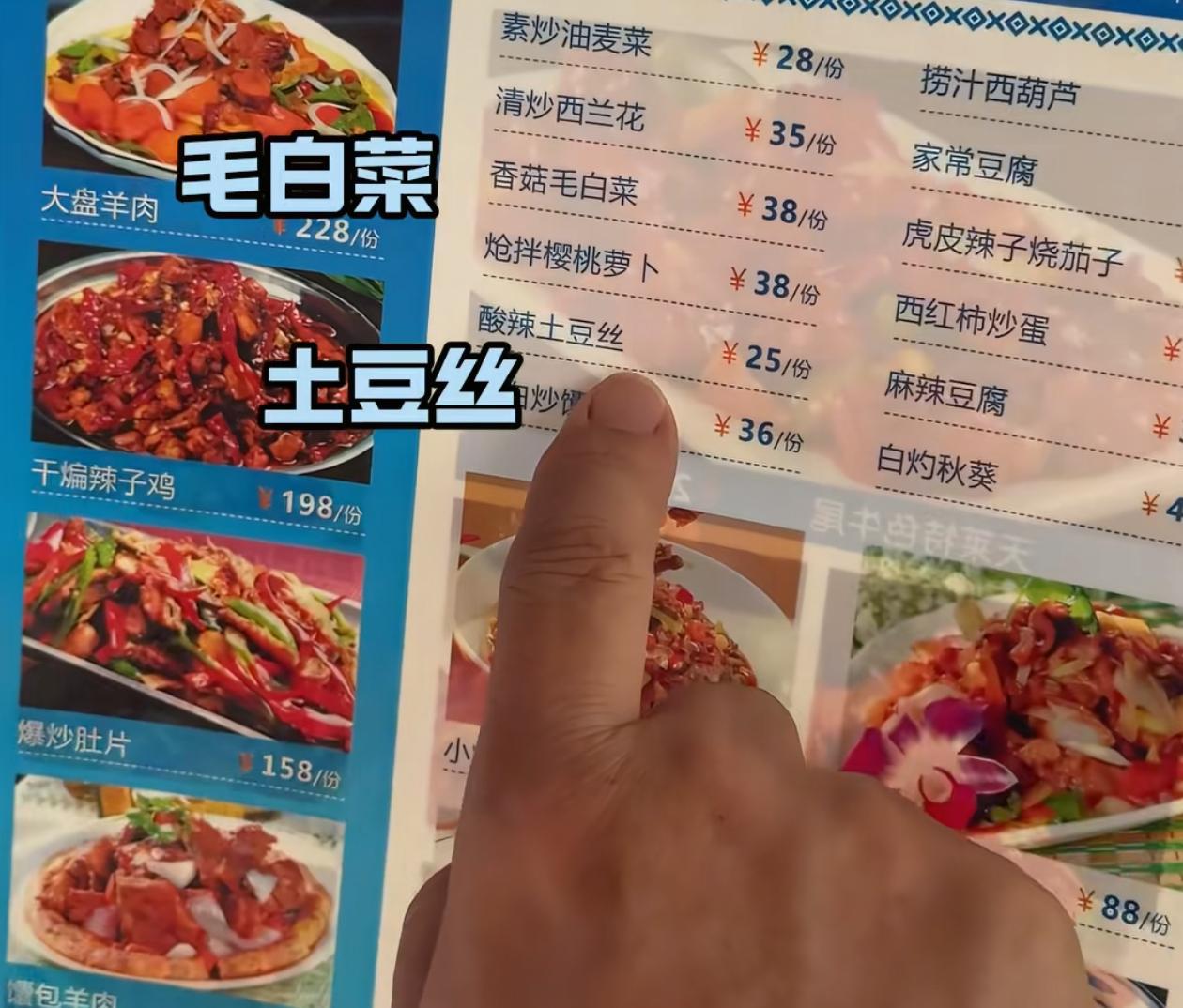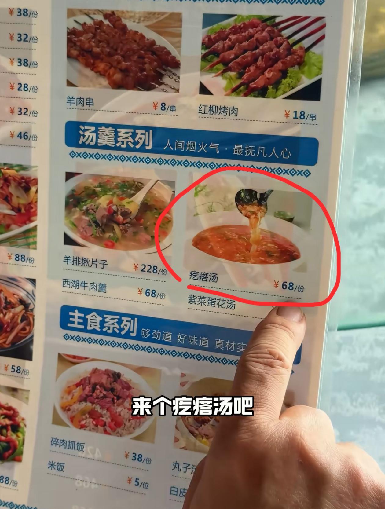 此外,他们还点了一份香菇毛白菜和一份酸辣土豆丝。李彬对那个68元的疙瘩汤特别感兴趣,也点了一份,看上去非常美味。