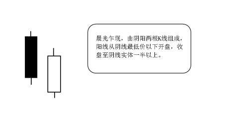 ‘晨光乍现’由两根K线巧妙组合而成:第一根为阴线,象征着市场的下跌或调整;第二根则为阳线,且这根阳线需从阴线的最低价以下开盘,并收盘深入至阴线实体的二分之一以上。这一形态与之前介绍的‘浓云遮日’形成鲜明对比,共同构成了股市中的一组重要K线组合。图形展示如下(图3-14-1):