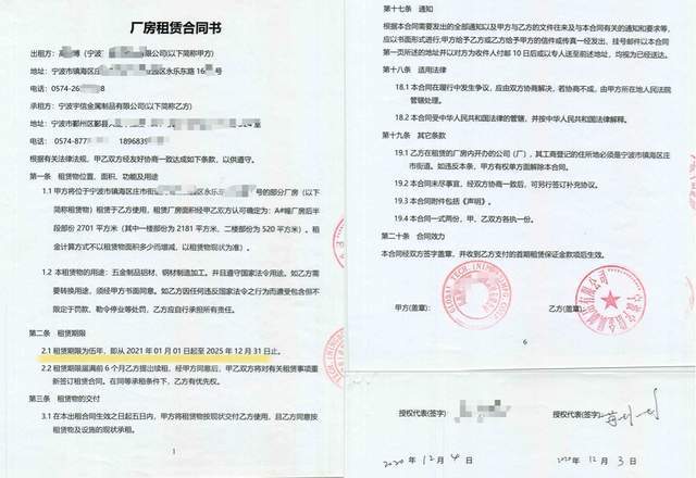 由于原有厂房不符合设备换代升级条件,2020年12月4日,宇信公司与高某博公司签订《厂房租赁合同书》,租赁其经营厂房园区中2701平方米的厂房用于生产经营,合同约定租期为五年,自2021年1月1日起至2025年12月31日止。