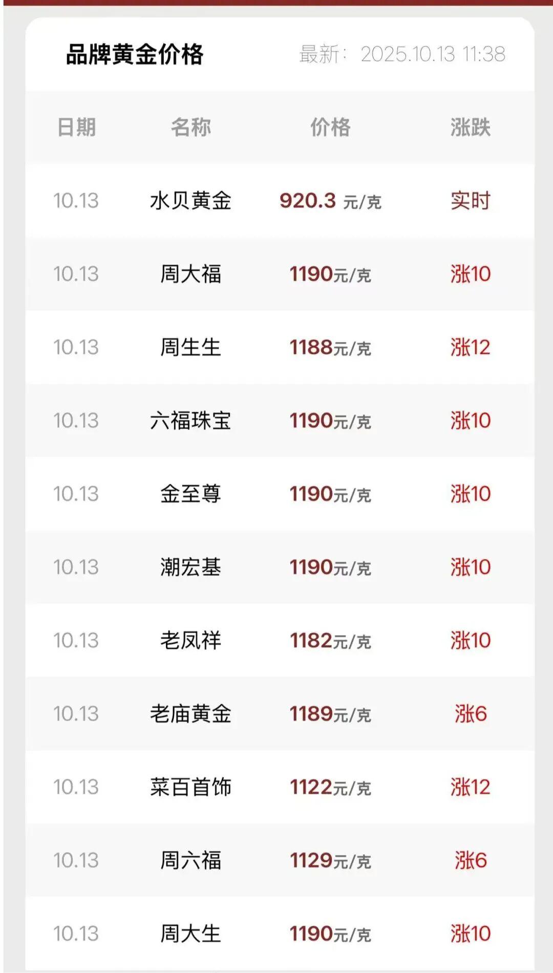 国内黄金饰品市场同样受到波及。10月13日,国内多家黄金珠宝品牌公布的足金首饰价格向上触及1190元/克,创下历史新高。