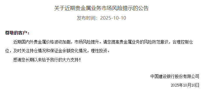 10月10日,建设银行发布关于近期贵金属业务市场风险提示的公告。公告称,近期国内外贵金属价格波动加剧,市场风险提升。建议投资者提高贵金属业务的风险防范意识,合理控制仓位,及时关注持仓情况和保证金余额变化情况,理性投资。
