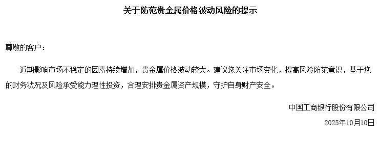面对市场波动,多家银行发布贵金属业务风险提示。建设银行、工商银行等银行在官网发布公告,提醒客户注意贵金属价格波动加剧,应合理控制仓位,理性开展投资。