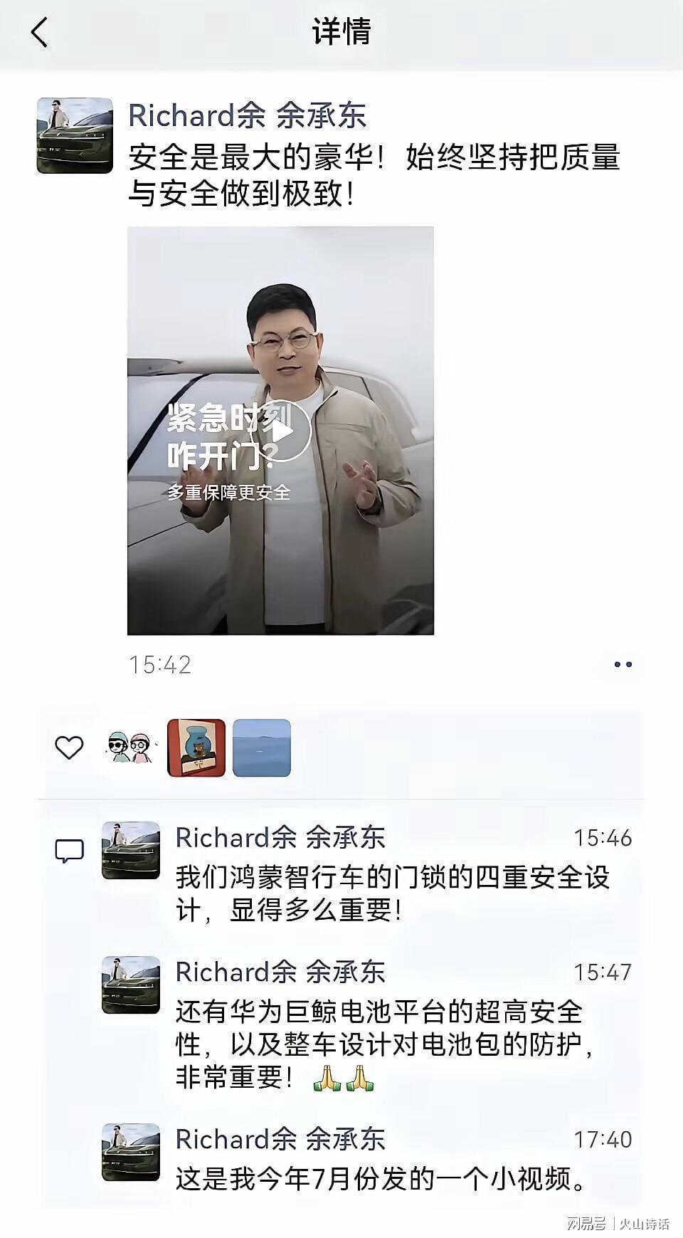 很快,余承东发的朋友圈流出,看来他也关注到了成都小米su7的事故。他强调,安全是最大的豪华!始终坚持把质量与安全做到极致!