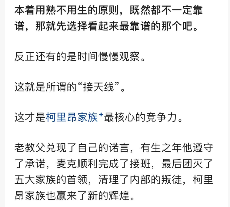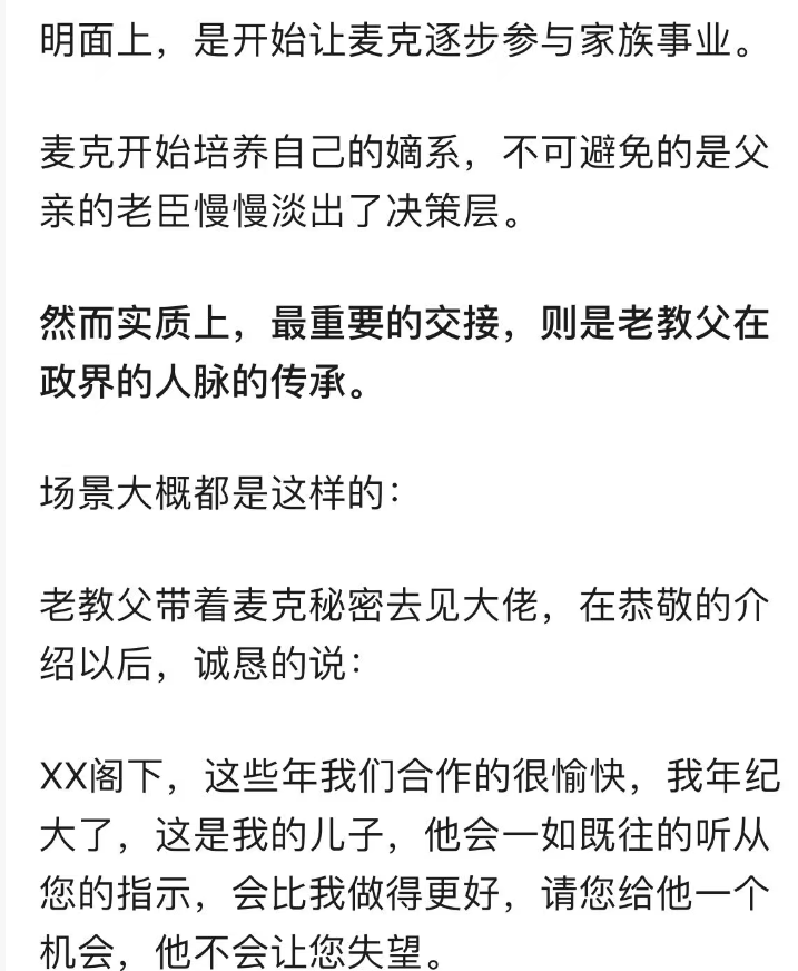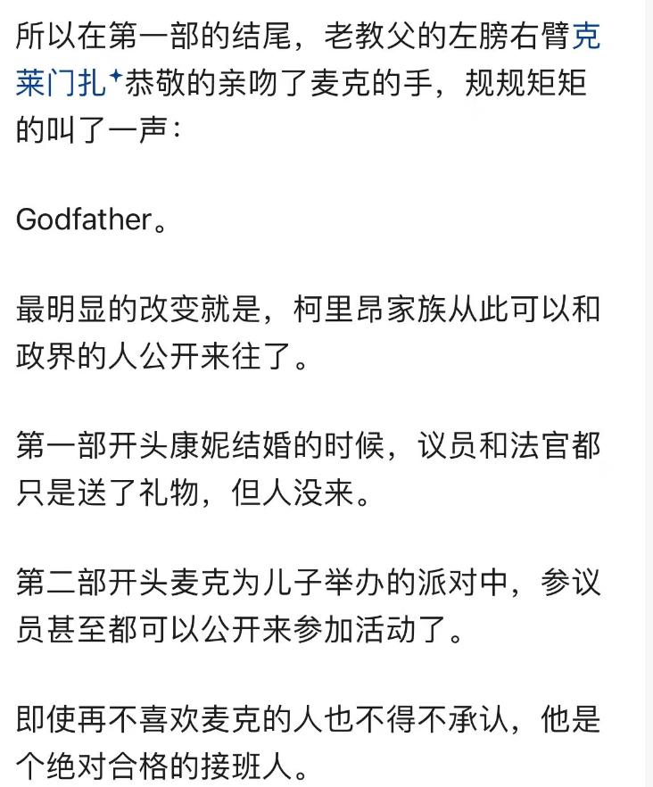 网友们之所以认为宗大小姐高看自己,部分原因源自对国外经典影视作品中类似角色的对比。比如,在经典影片《教父》中,麦克的接班过程就展现了上一代对下一代的精心栽培与交代。