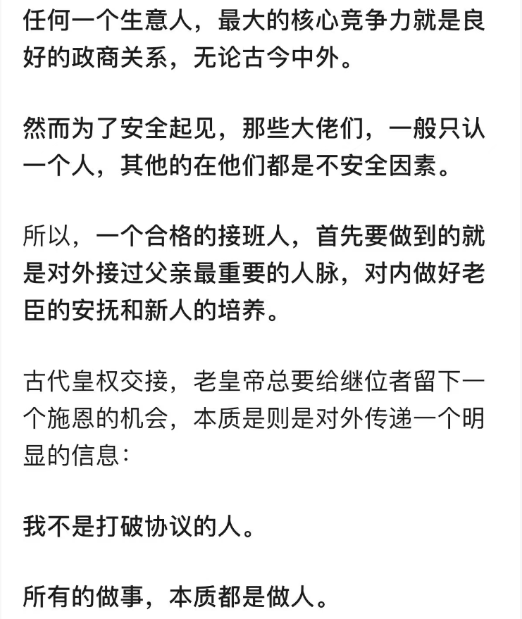 事实上,在家族企业传承中,上一代为了确保下一代能够顺利接班,通常会有一套完整的流程,至少会把关键事项交代清楚。这样做的目的,既是为了给下一代铺路,也是为了让其他各方安心。