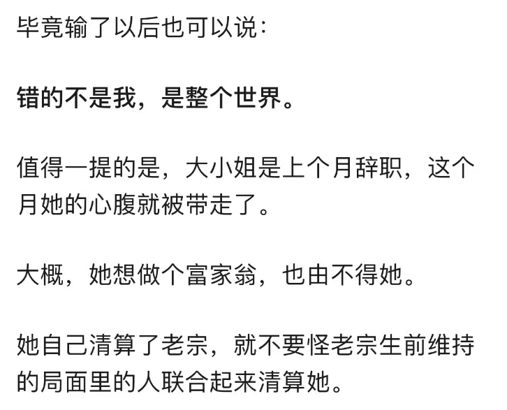简而言之,宗大小姐被指过于自负,轻视他人,这种态度最终导致了她离职的局面。而令人惊讶的是,对于她的遭遇,并没有多少人表示同情。
