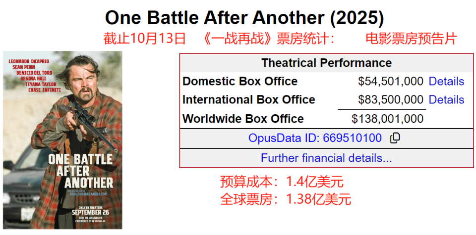 毕竟10月17日,《一战再战》要在内地公映了。该片的预算成本超过1.3亿美元,亏是肯定要亏一些的,但如果明年颁奖季有所斩获,其实,华纳这一波投资就不会亏损。