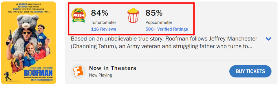 影片由“钱老板”查宁·塔图姆主演,《蓝色情人节》导演德里克·吉安弗兰斯执导,是一部喜剧犯罪片。烂番茄好评度84%,CinemaScore评分B+,爆米花也有85%,总体来说,还是很好的。