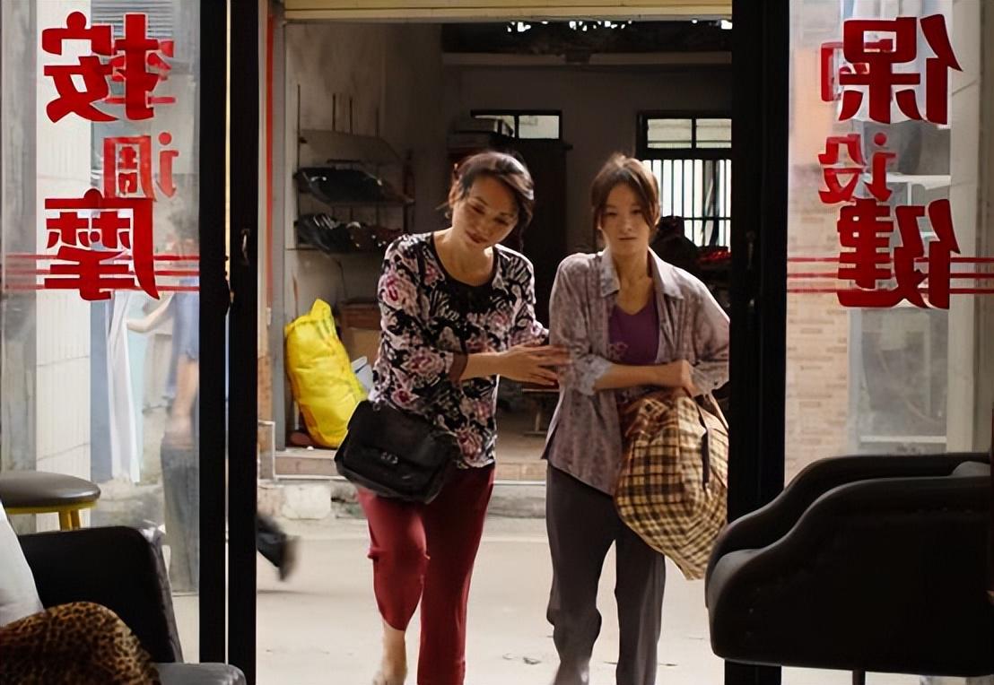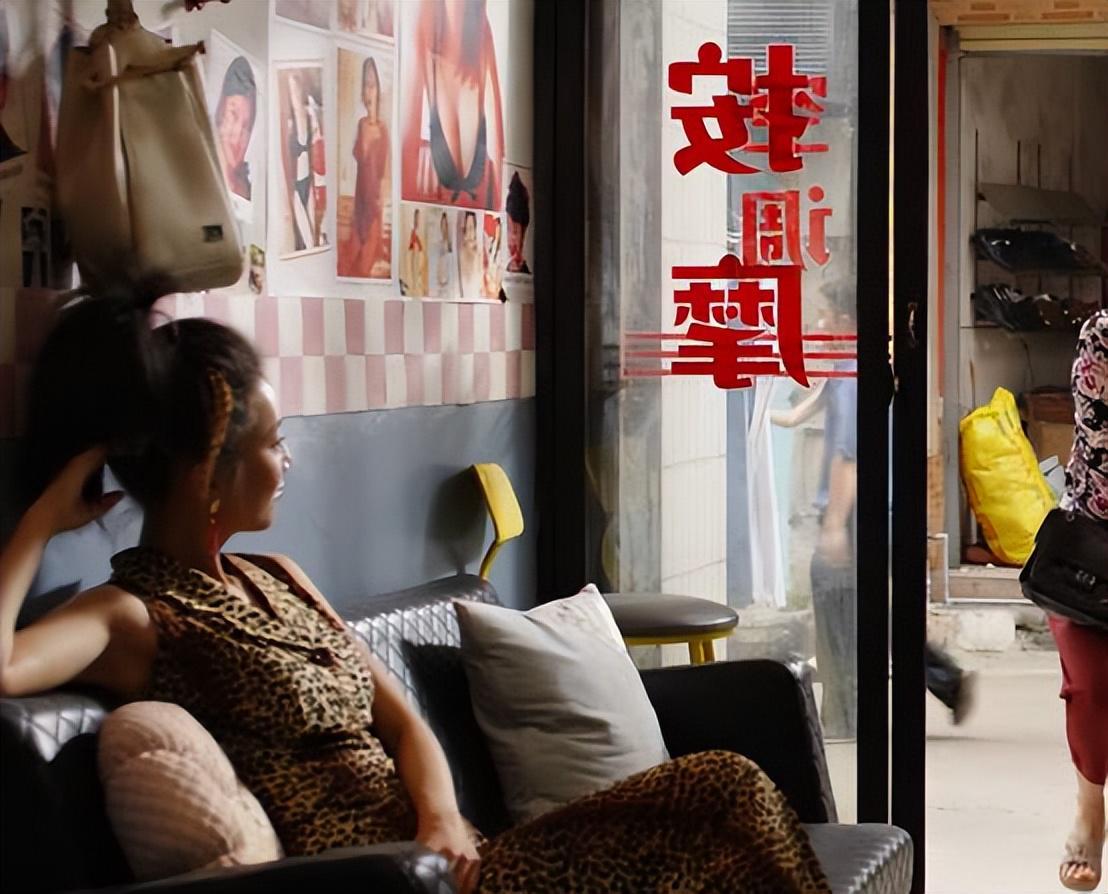 吴细妹初入城市时,被介绍人带进一家挂着“按摩、保健、洗头”招牌的理发店。推门而入,墙上性感火辣的美女海报瞬间暗示了场所的“特殊性质”。而坐在沙发上的阿鹃,虽戏份不多,却以深V豹纹长裙、高马尾和烈焰红唇的造型惊艳全场。她的妆容艳丽,耳环与红唇呼应,仅一个正脸镜头便让观众感受到扑面而来的“风尘味”。