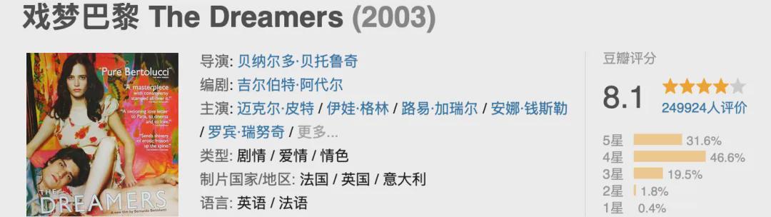 贝托鲁奇执导的《戏梦巴黎》以1968年巴黎学生运动为背景,讲述美国留学生马修与龙凤胎兄妹西奥、伊莎贝尔的疯狂故事。马修作为电影迷,在法国电影资料馆偶遇这对对电影充满热情的兄妹,并受邀搬入他们家中。