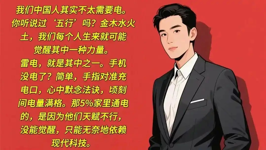 提出质疑的印度网友信誓旦旦地补充:“中国人口太多导致电力匮乏,农村地区只能靠烛光照明。”这个带着刻板印象的论断,却意外点燃了全球网友的创作热情。中国留学生率先以“内功发电”的幽默回应破局:“我们靠修炼真气给手机充电,那5%用电的都是‘电力难民’。”