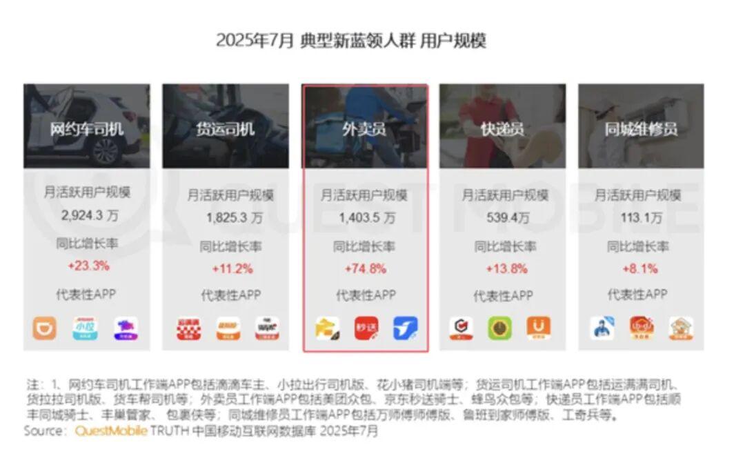 灵活就业人群主要分为四种,包括网约车司机、货车司机、外卖员和快递员。根据QuestMobile的数据,这些领域的参与者数量都在大幅增加。除了维修员外,其他领域的同比增幅都在两位数以上。特别是外卖员的增幅,竟然高达74.8%。这一数据虽然惊人,但也反映了当前就业市场的趋势。
