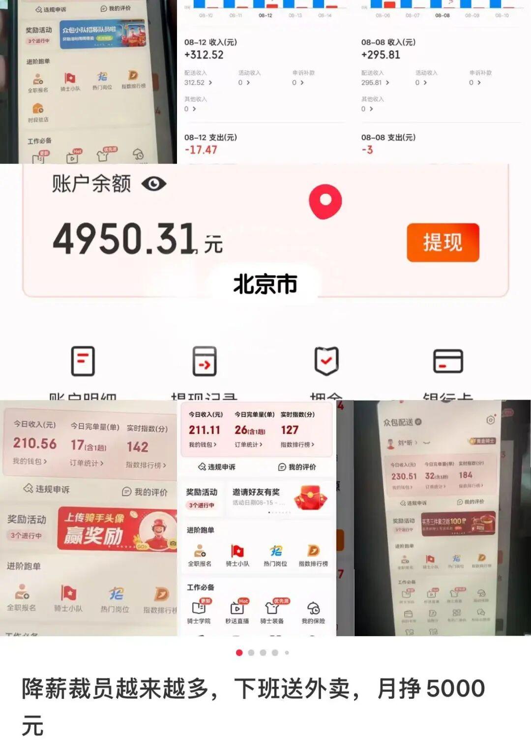 当被问及毕业找不到工作怎么办时,不少年轻人的回答是:送外卖去呗。同样,对于中年人而言,裁员后找不到工作,送外卖也成了他们的选择。外卖的门槛相对较低,只需一部手机和一辆电动车,就能开始工作。相比之下,网约车还需要驾照和租车等成本。