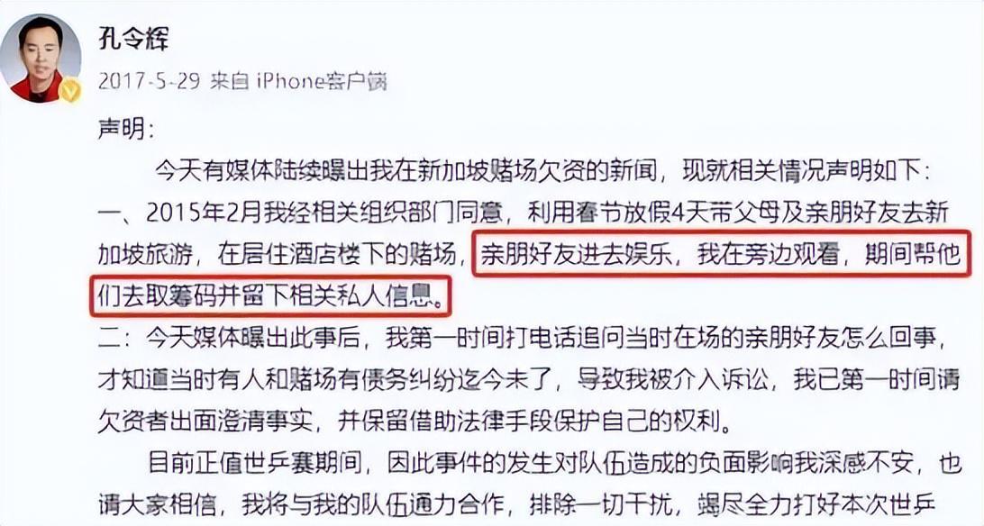 新加坡的一家赌场向香港法院提起了诉讼,表示孔令辉欠了他们200多万的赌资。
