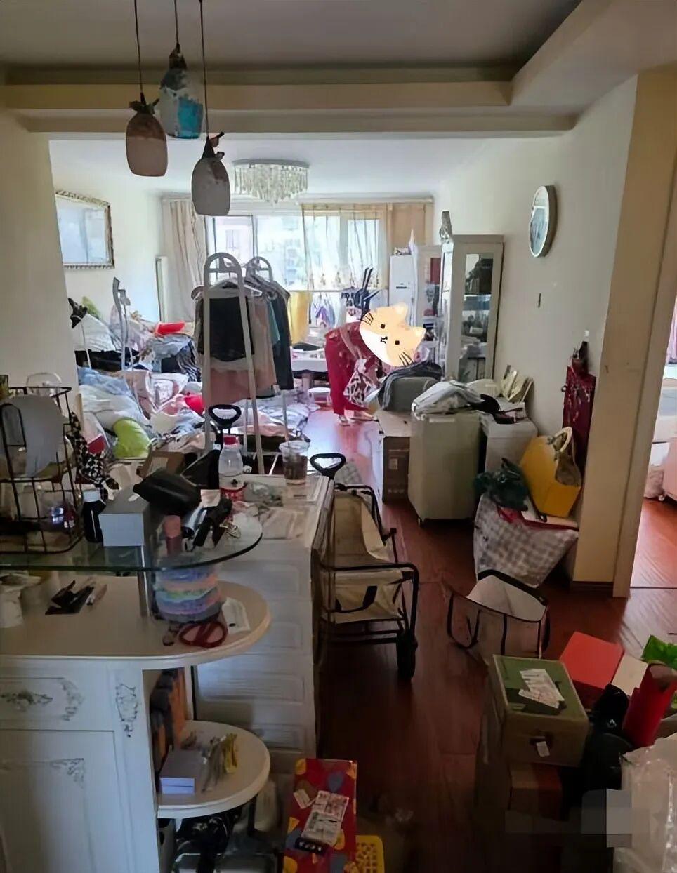 衣服堆得像小山,化妆品和食品一起散在地上。