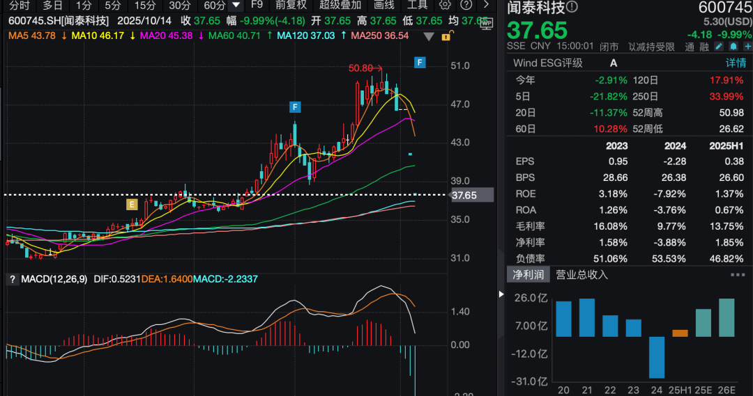 资本市场对此反应强烈。10月14日,闻泰科技股价再度跌停,复牌后连续两日触及跌停板。