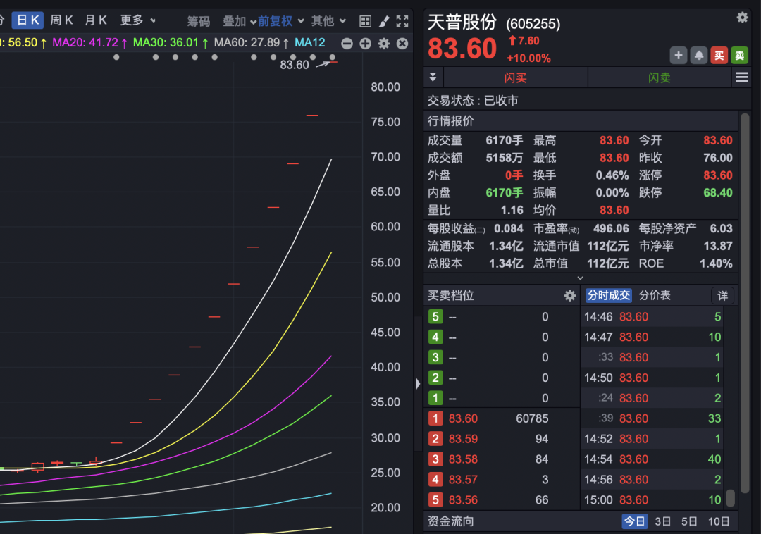 近日,天普股份(605255)在资本市场上引发广泛关注,其股价自2025年8月22日以来,已连续12个交易日实现一字涨停,累计涨幅高达213.81%,最新报收83.6元/股,市值达到112亿元。然而,面对如此强劲的涨势,天普股份却紧急发布公告,提醒投资者注意股价风险。
