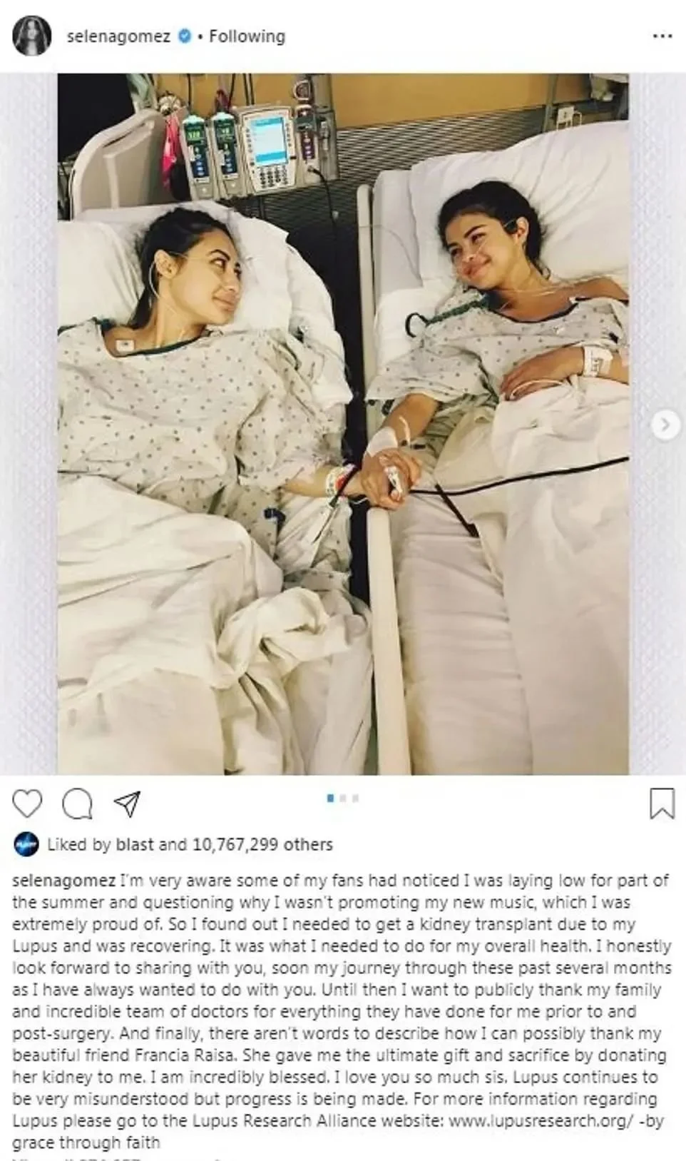 2013年,赛琳娜被诊断出患有红斑狼疮,此后一直服用药物控制病情。然而,2017年病情复发,急需进行肾脏移植手术。关键时刻,她的好友弗朗西娅挺身而出,主动进行配型检测,并成功捐献了一颗健康的肾脏。