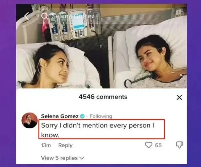 对此,弗朗西娅在新闻评论区回复了一句:“真有趣。”随后删除了评论并取关了赛琳娜。面对弗朗西娅的质疑,赛琳娜回应道:“抱歉,我没有提到所有认识的人。”