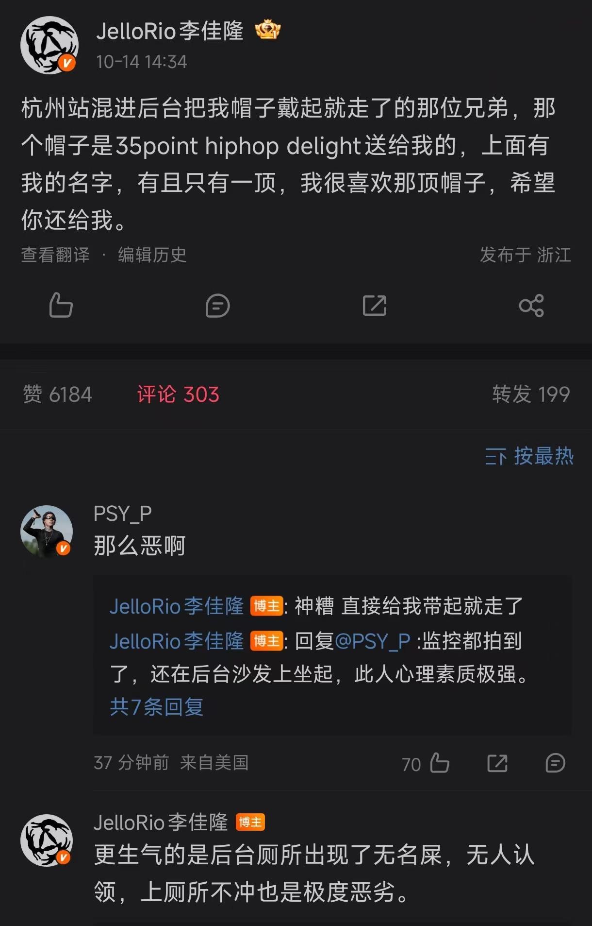 此事件迅速引发了另一位说唱歌手PSY.P的注意。李佳隆透露,这个偷帽子的人心理素质极佳,不仅成功混入演出后台,还大摇大摆地坐在后台沙发上,最终顺走了他的帽子。这种行为实在是让人瞠目结舌。