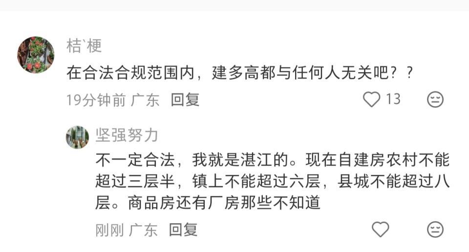 这一情况迅速在网络上引发了网友的热议。有网友质疑道:“全红婵家不盖,你家不盖,全红婵家一盖,你家就盖,而且盖得更高,这是故意要压奥运冠军一头吗?”还有网友表示,自己就是湛江当地人,现在自建房有明确的规定:农村不能超过三层半,镇里不能超过六层,县城不能超过八层。全红婵家三层半,完全符合规定,但邻居家已经有六七层那么高了,明显违反了规定。