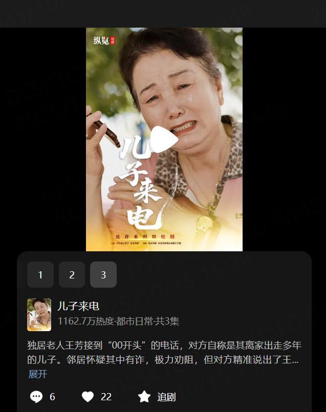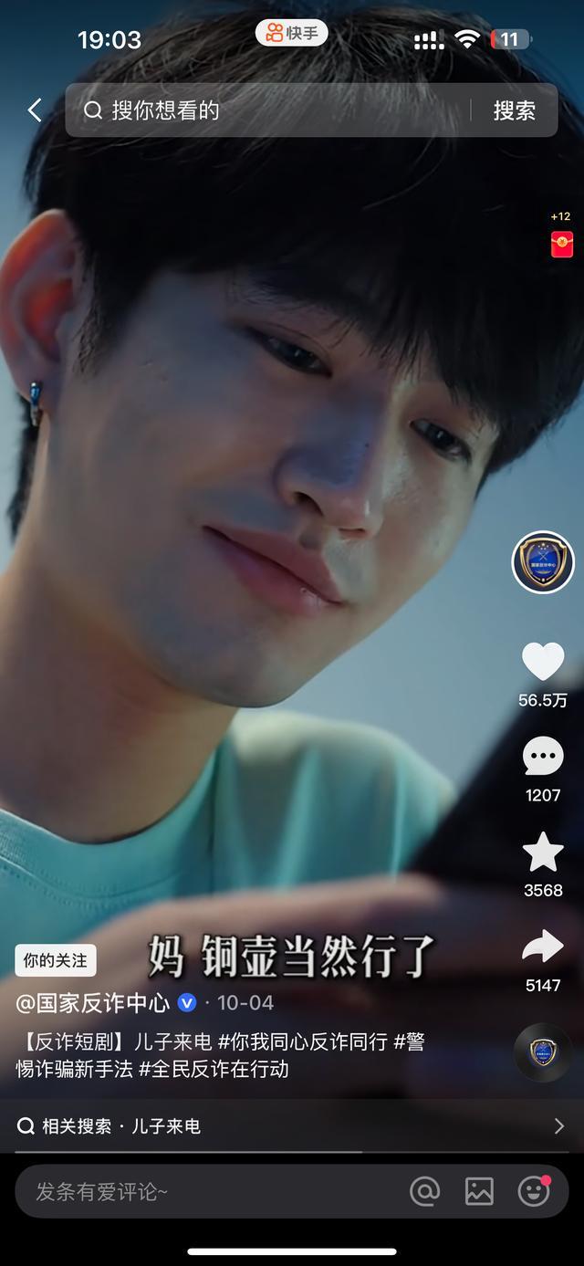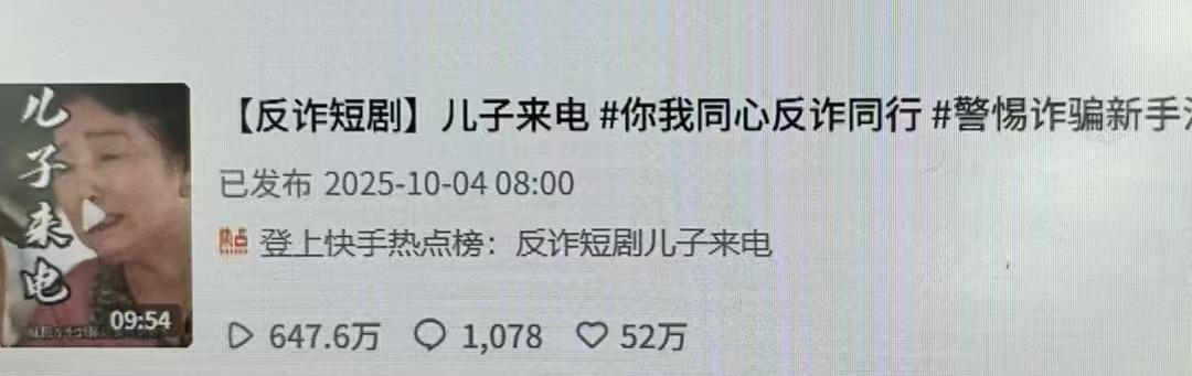 近日,由纵览(河北)传媒有限公司与河北省公安厅联合出品的反诈系列微短剧《儿子来电》成为网络热议焦点。该剧上线后迅速登上快手全国热榜,热度突破千万,引发网友广泛关注与好评。截至10月15日,该剧在快手平台累计播放量超650万次,点赞量超55万次,评论区涌现大量正向反馈。