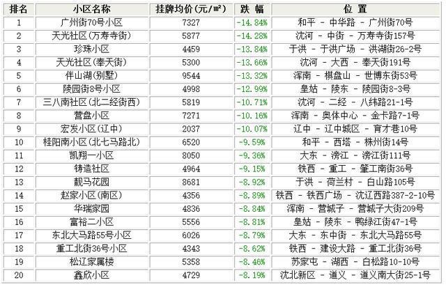 与涨幅榜形成鲜明对比的是,沈阳也有一些小区的房价出现了下滑。以下是10月沈阳二手房跌幅最大的几个小区: