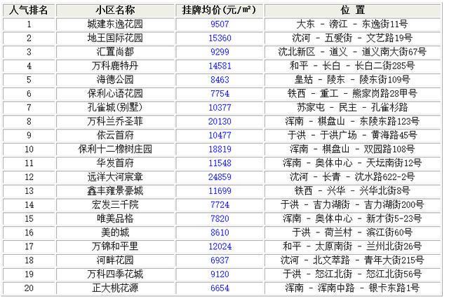 除了涨跌榜外,购房者还非常关注哪些小区的关注度最高。以下是10月沈阳二手房关注度最高的几个小区: