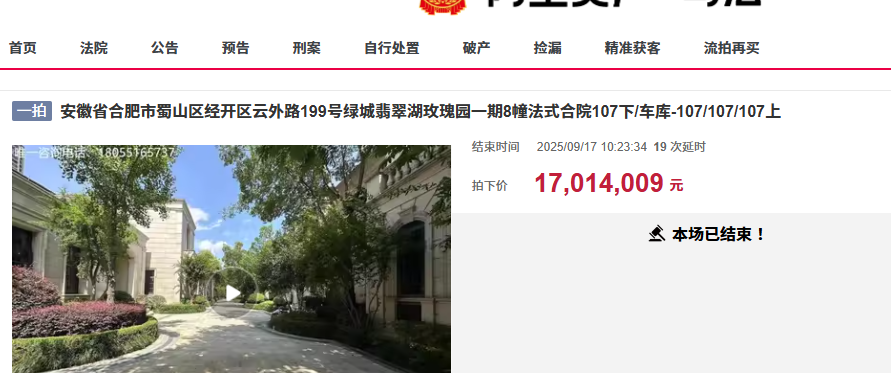9月17日,合肥市司法拍卖市场迎来一宗备受瞩目的豪宅拍卖。此次拍卖的标的为位于合肥市蜀山区经开区云外路199号绿城翡翠湖玫瑰园一期的一栋法式别墅,建筑面积达567.7平方米,已装修但内部豪华程度未公开披露。