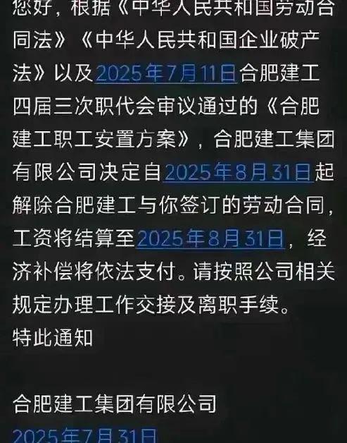 手机屏幕突然亮起,一条来自合肥建工集团的短信让我心沉谷底。白纸黑字,通知我工作至8月31日即止,工资结算至该日,补偿金将“依法支付”。这突如其来的消息,如同最后通牒,让人措手不及。