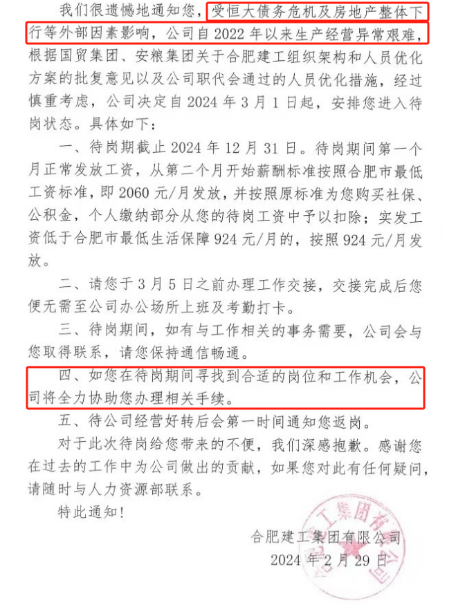 其实,早在今年2月底,公司便已显露出颓势。突然发布的“待岗通知”,让上千名员工措手不及。通知上明确写着:受恒大拖累,公司经营困难。工资仅发放当地最低标准的基本工资,这无疑是变相裁员,旨在节省开支。然而,公司难,员工更难。房贷、车贷、孩子学费……哪一样能少?那段时间,人心惶惶,未来一片迷茫。