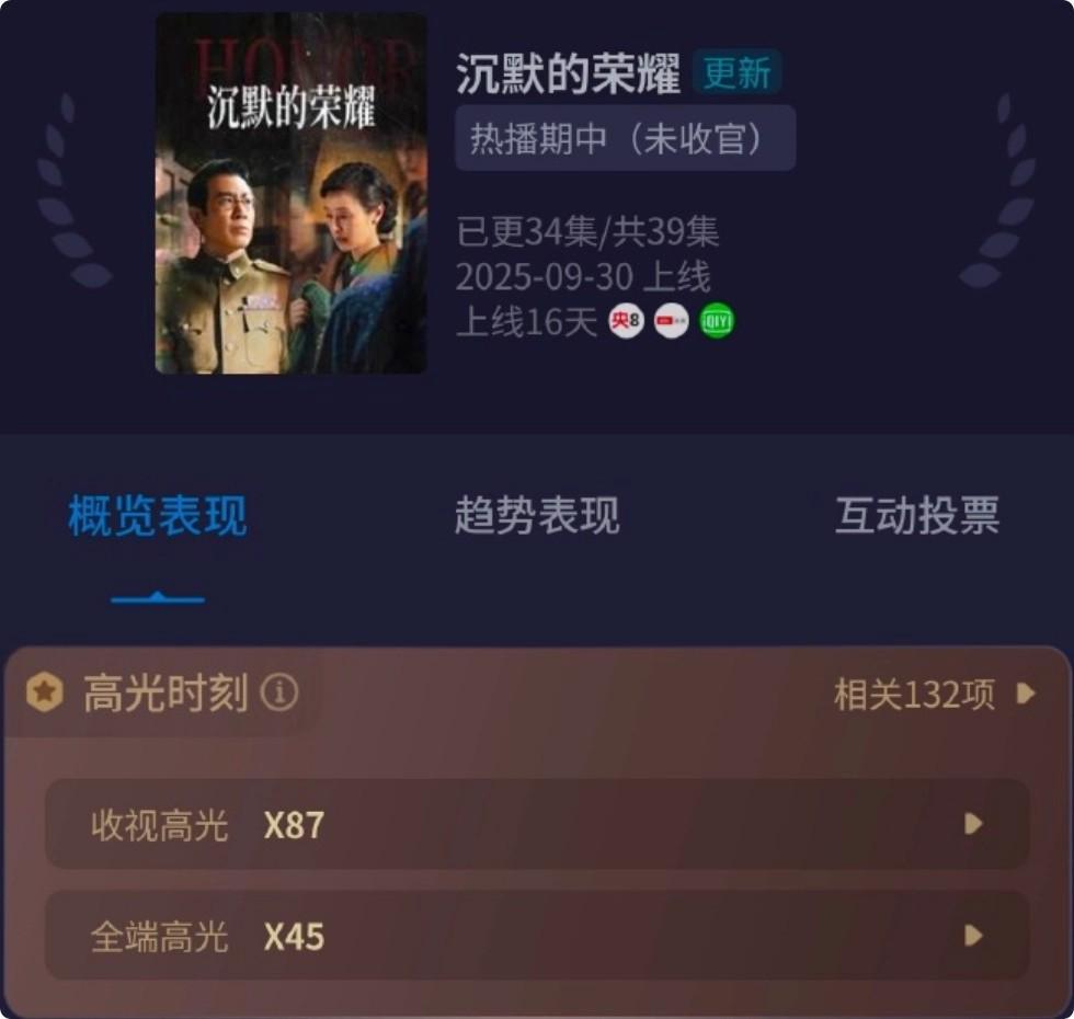 谍战剧《沉默的荣耀》自央视八套黄金档开播以来,迅速成为2025年国产剧市场的现象级作品。该剧不仅以4%的收视率创下央视年度新高,更在全网热度榜连续霸榜,微博话题阅读量突破6亿次,抖音短视频播放量高达数十亿次,堪称“年度高分局”。
