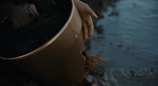 当他开着摩托顺着溪流找到那棵树时,却惊讶地发现:漂流过程中发生的碰撞导致了破盆,但树的根茎却在此时快速生长。这一景象引起了他思想的巨震,也撬动了他成长的回忆。