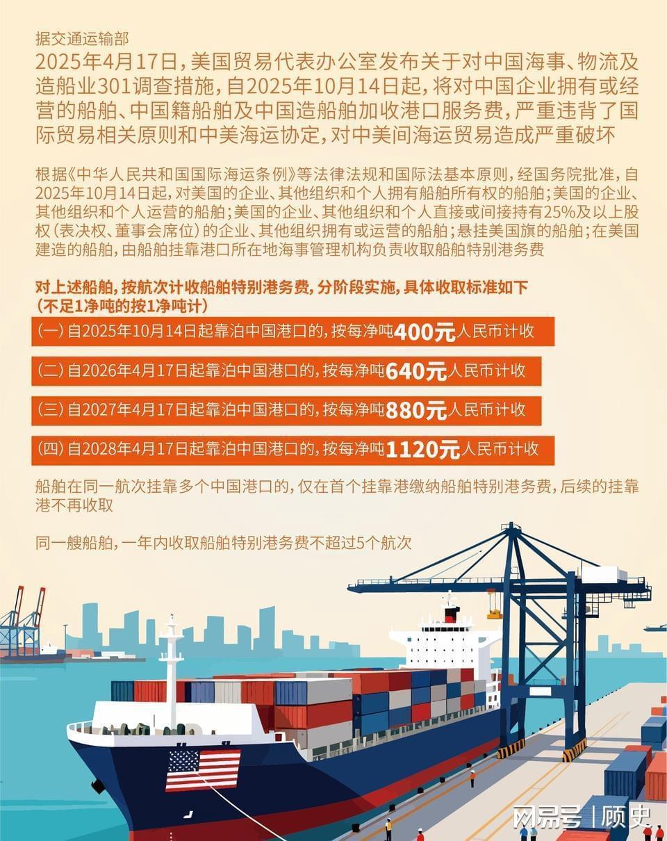 针对特朗普的这一无理制裁,中国采取了对等制裁的手段进行反击。与美国的港口费一次性收取不同,中国的港口服务费是递增的。例如,今年中国对美国船舶的收费是每净吨400元人民币(比美国多4块钱),但到2026年4月份时每净吨要交的钱就是640元,到2027年4月份时收的钱是每净吨880元,到2028年时收取的费用更是高达每净吨1120元。