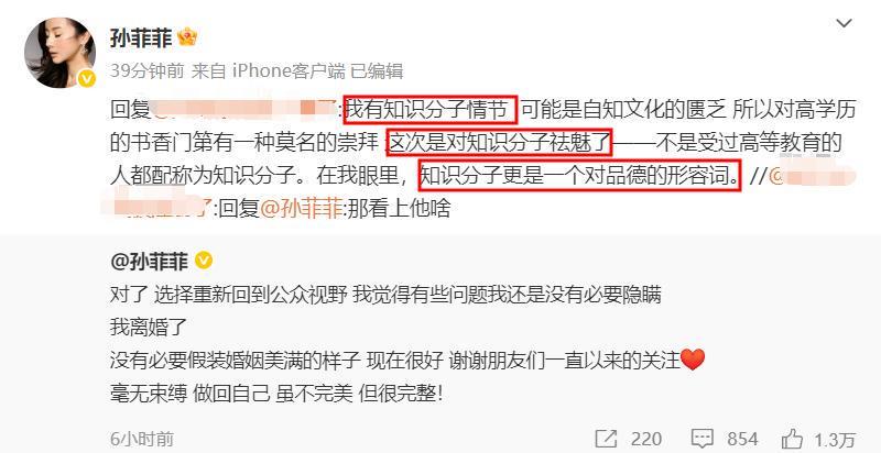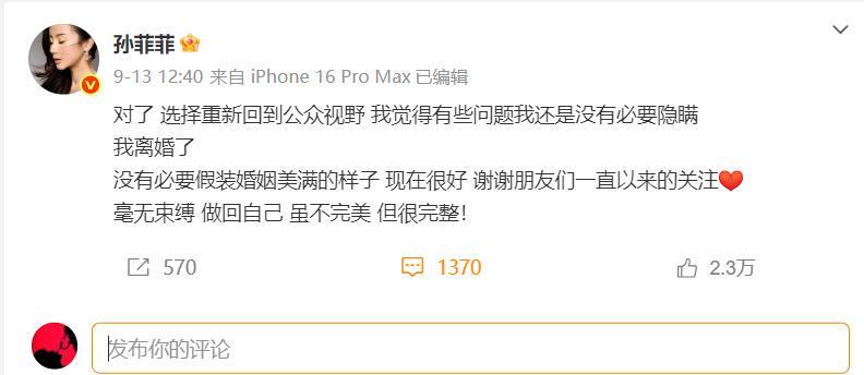 9月13日,孙菲菲官宣了离婚的消息,她说她没必要装婚姻幸福美满的样子。