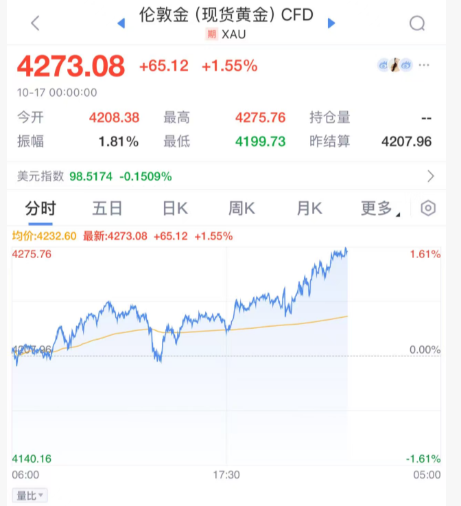 北京时间10月16日晚间,全球金融市场再度被黄金的强势表现所震撼。现货黄金价格加速攀升,盘中最高触及4275美元/盎司,日内涨幅达到1.5%,创下历史新高。