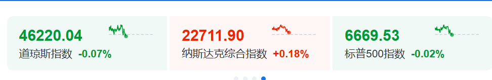 与黄金市场形成鲜明对比的是,美股三大指数16日晚间呈现震荡走势。道琼斯指数微涨0.2%,纳斯达克指数下跌0.5%,标普500指数基本持平。