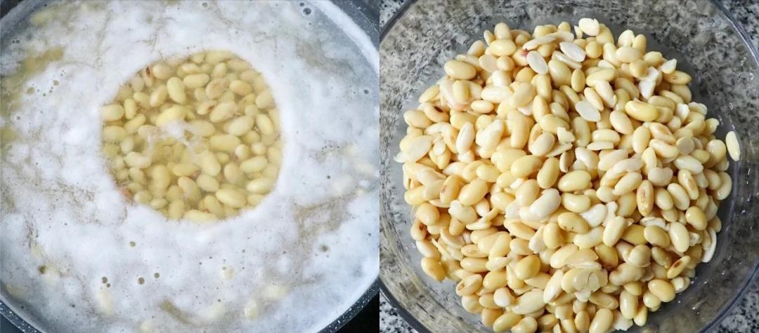 2、接着,在锅里放适量的清水,等水有点温乎的时候,就把泡好的黄豆放进去,然后开大火煮。煮个 7 分钟左右,你就会看到水面上起沫了,拿个勺子把浮沫都撇掉,再把黄豆捞出来,用清水洗一洗,沥干水分。