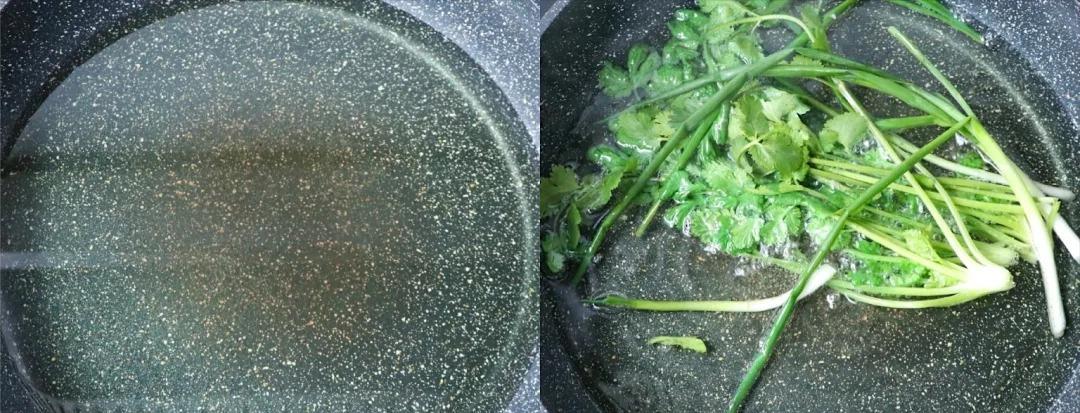 3、在锅里倒上油,等油热了,把香菜和香葱放进去,这时候把火调成中小火,等香味出来了,就把香菜和香葱捞出来。