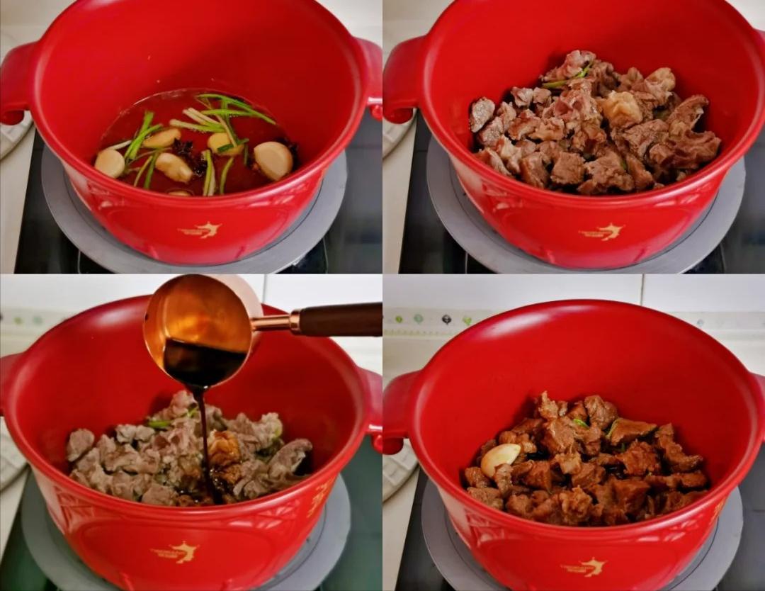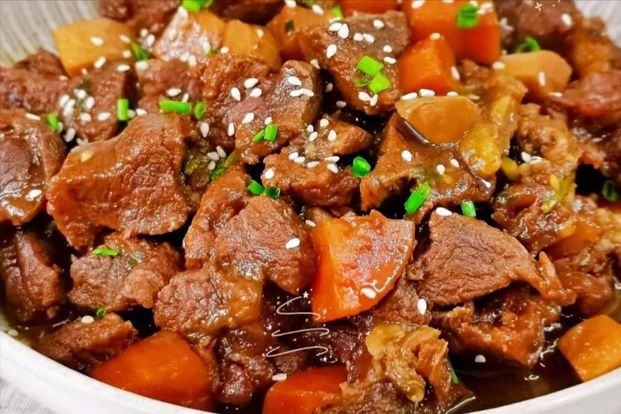 食材:800 克牛腱子、1 根胡萝卜、1 个杏鲍菇、葱姜蒜香菜、八角来 3 个、冰糖 3 克、熟芝麻 2 克、料酒 2 勺、生抽 2 勺、蚝油 1 勺、老抽 1 勺,盐就按自己的口味来放就行