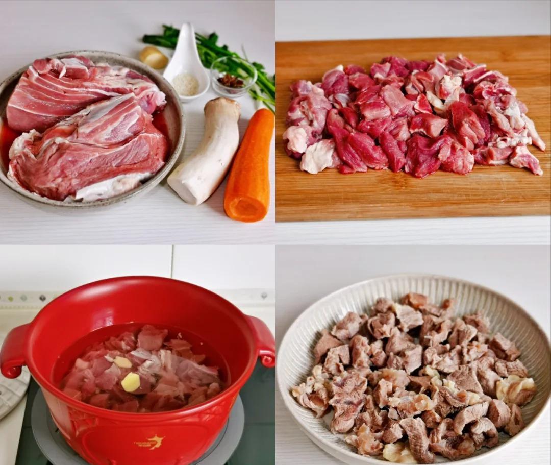 1、先把牛腱子放到冷水里泡着,让它把里面的血水泡出来。这一步可不能省,泡出血水后牛肉的腥味就会大大减少。然后捞出来切成小块放进砂锅里,再加点冷水,放几片姜片进去,开火把水烧开,煮个 2 分钟。这其实就是给牛肉焯个水,把里面的脏东西煮出来。煮好后,把牛肉块捞出来,用温水冲洗干净。因为用冷水冲的话,牛肉遇冷收缩,就不容易炖烂啦。