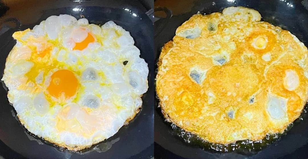 2、就是往锅里倒点油,油稍微有点冒烟的状态。这时候再把鸡蛋打进去,注意哦,鸡蛋不用打散,就整个打进去。这样煎出来的鸡蛋不容易粘锅,而且煎出来的鸡蛋口感特别好。等鸡蛋一面煎得金黄了,就给它翻个面,再煎另一面,直到两面都金黄,就可以把鸡蛋盛出来,用刀切成小块,放在一边备用。