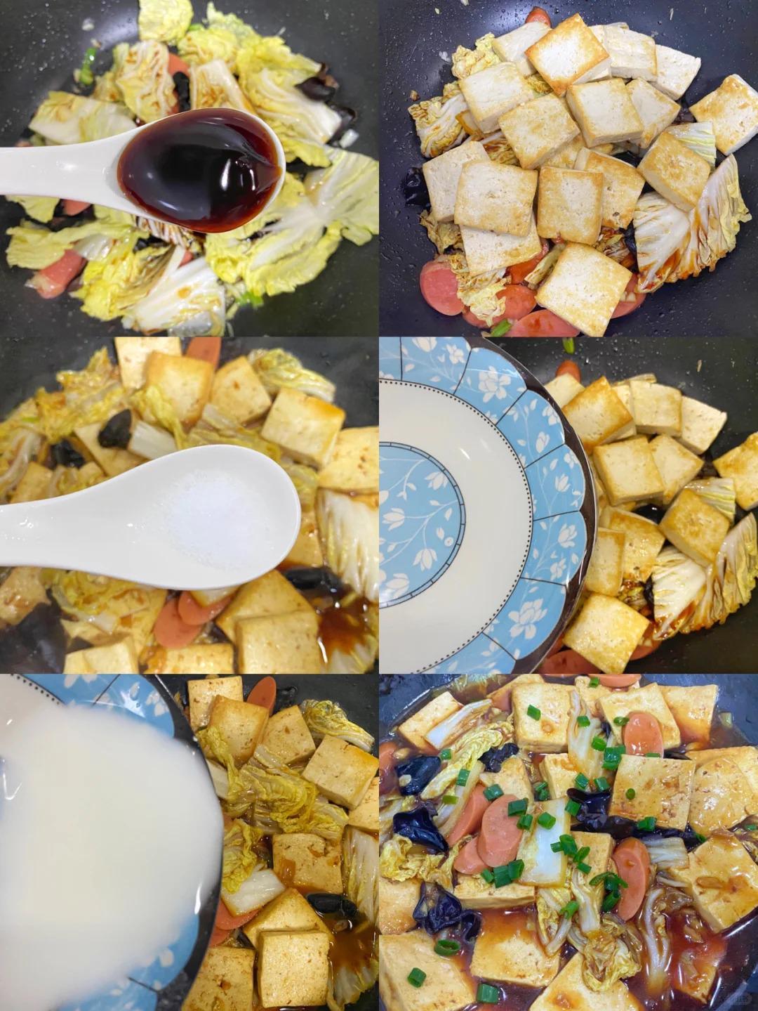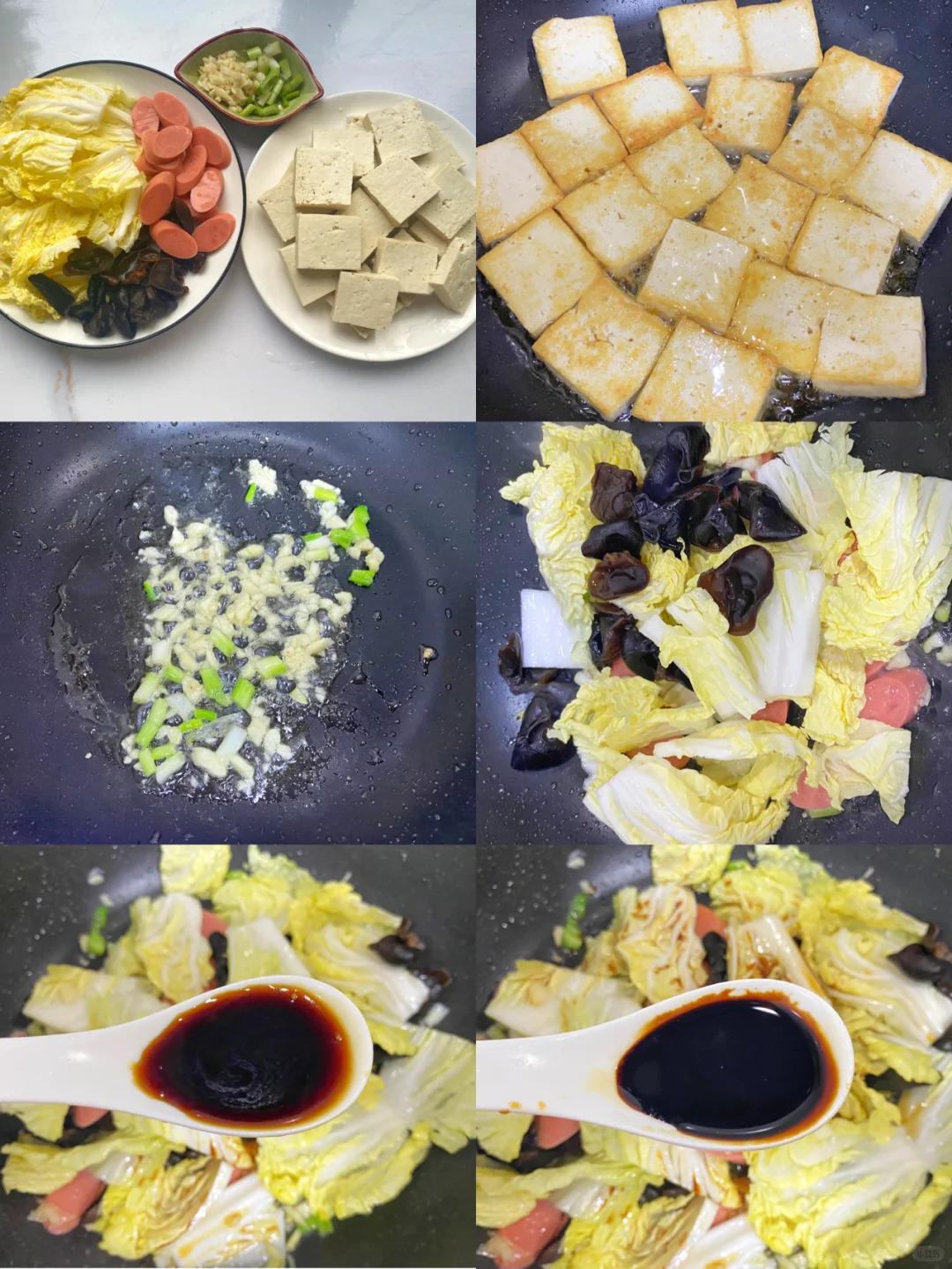 3、葱蒜炒香之后,就把白菜、木耳还有火腿都放进锅里一起炒。一边炒一边看着点,等它们都炒得变软了,就可以调味了。往锅里加一勺生抽、半勺老抽、一勺蚝油,这几种调料一加进去,锅里的菜立马就变得有滋有味了。接着把刚才煎好的豆腐也放进锅里,再撒上少许盐,最后倒上一碗清水。这时候把锅盖盖上,开中火煮开,然后再转成小火焖煮个五分钟。