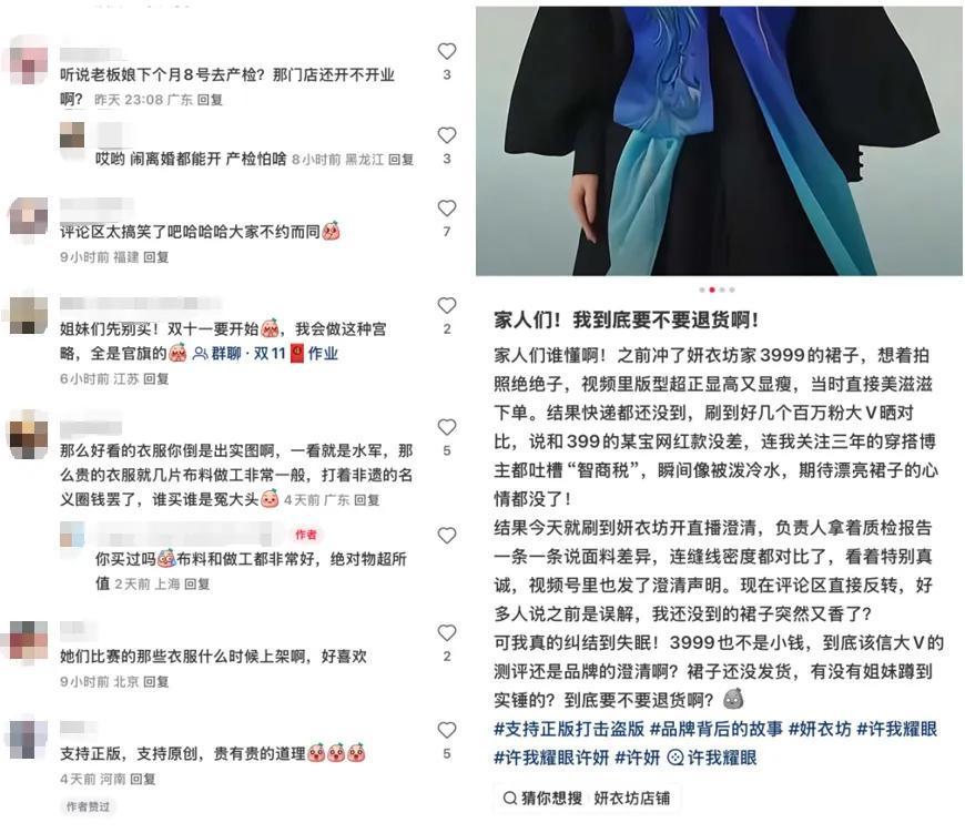 从抖音到小红书,围绕《许我耀眼》的二次创作涌现:有人假装“妍衣坊”真实存在,讨论定价与发货速度;官方抖音账号“妍衣坊”粉丝达21万,超越众多小众品牌。这种“抽象快乐”的传播效应,成为剧集外的另类成功。