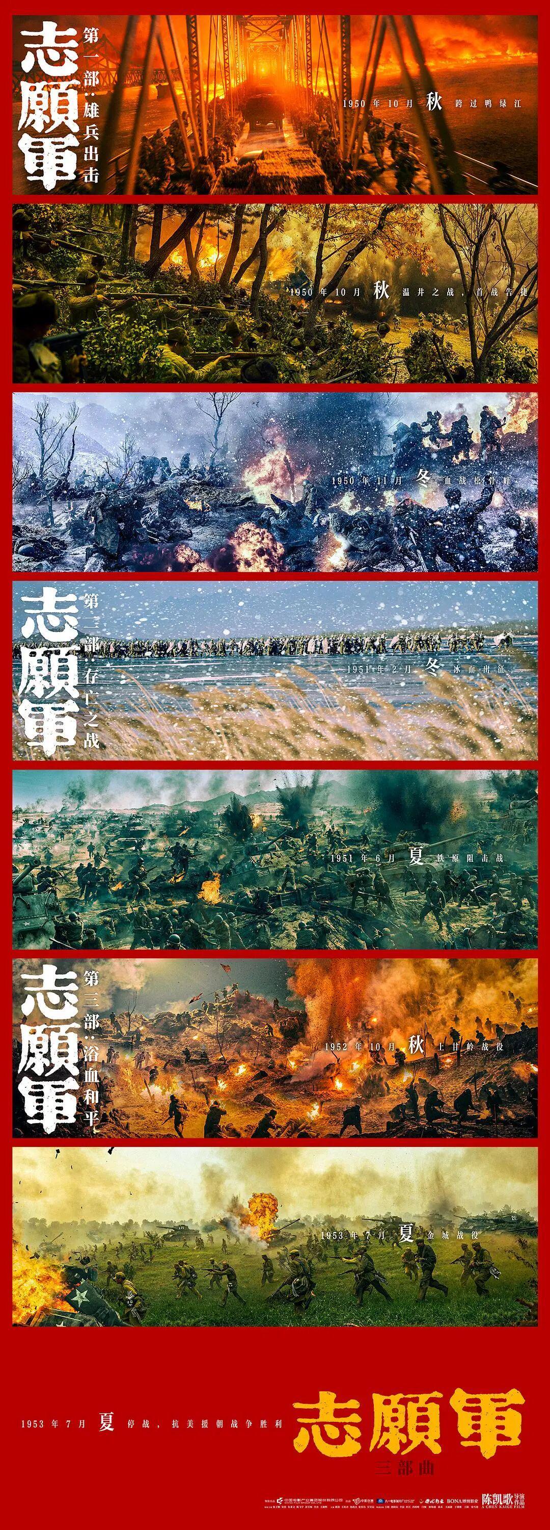 然而,当市场的喧嚣逐渐沉淀,主旋律创作也迎来了瓶颈。一个问题随之浮现,在这样单点爆款的模式之外,主旋律战争电影是否能构建一种更具延续性、更成体系的叙事模式?这种模式不同于多年前《大决战》一类国家主导型创作,而是需要植根于当下市场和社会需求。正是在这个背景下,《志愿军》三部曲的出现就显得应运而生。它用一个系列运营的体量,试图梳理一场立国之战的逻辑链条。这份行业野心,首先就体现在其叙事结构上的层层递进。